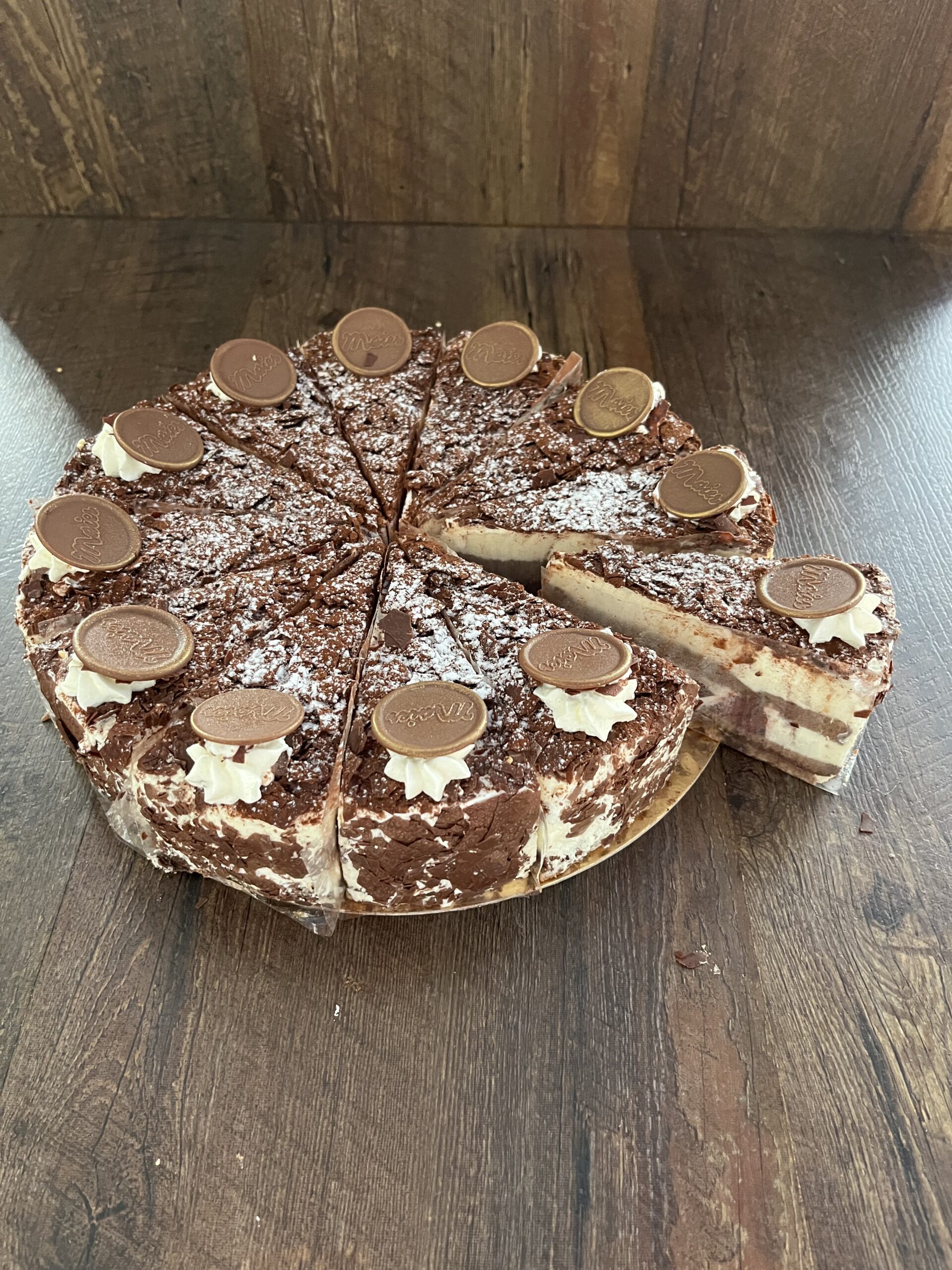 VOLLRAHM, Schokocrispboden [WEIZENMEHL, Zucker, HASELNÜSSE, Kokosöl, Rapsöl, Wasser, MAGERMILCHPULVER, BUTTER, Aroma, Speisesalz, Gerstenmalzextrakt, Paprika, Antioxidationsmittel (E306), Milchcouverture 38% [Zucker, Kakaobutter, Kakaokerne (Grenada) 11%, VOLLMILCHPULVER, MAGERMILCHPULVER, RAHMPULVER, Emulgator (E322: SOJALEZITHIN), Vanille], HASELNUSSÖL], Biscuit [Zucker, WEIZENMEHL, EIER, WEIZENSTÄRKE, Kakaopulver, Backpulver, MAGERMILCHPULVER], Sauerkirschen, Kirschensaft, Zucker, Cremepulver mit Venillegeschmack [Maistärke, WEIZENSTÄRKE, Vanille Aroma, Farbstoffe (E160a, E101), Antioxidationsmittel (E301), Verdickungsmittel (E413)], Gelatine, Zimt